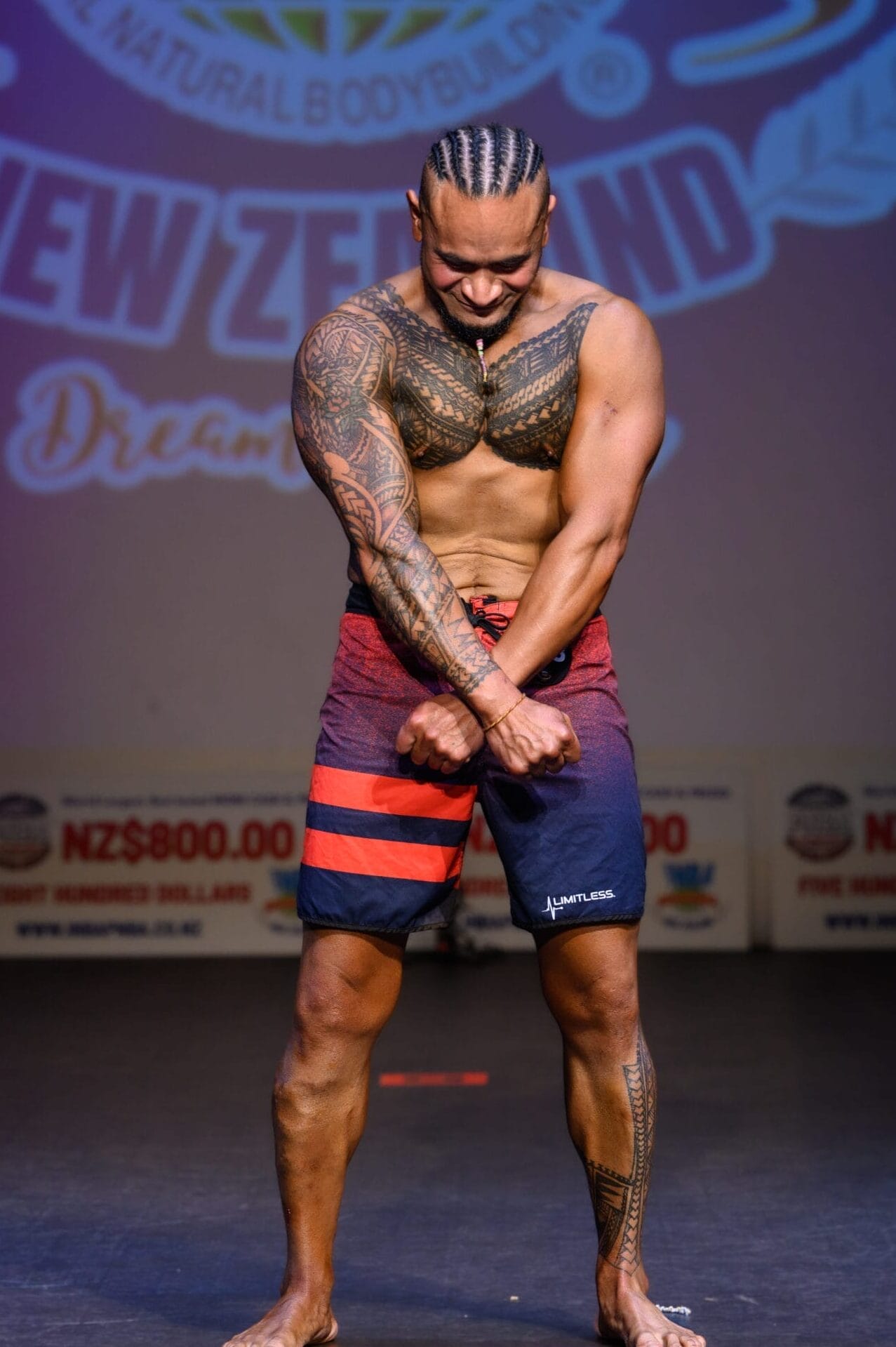 Competitors must wear board shorts with no elastic waistband. The board shorts must compliment the physique without being excessively tight, or too big. The length should be above the knee but no shorter than mid-thigh. Logos should be minimal and non-distracting.